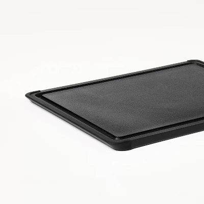 Slicing, dicing and chopping ingredients will be easier than ever with this 2-Piece Nonslip Recycled Poly Cutting Board Set from Figmint™. Made from recycled polyester in black, this set includes medium and large black cutting boards with smooth surfaces for easy swiping of ingredients and easy cleaning. The boards have nonslip sides that grip your countertop to keep them in place, and tapered edges make them easy to lift off the countertop to help prevent dropped ingredients. Integrated juice grooves help reduce spills, and the boards can be tossed in the dishwasher for easy cleaning after use.