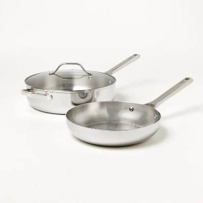 - Aluminum cores are fully surrounded by two layers of stainless steel to help distribute heat quickly and evenly